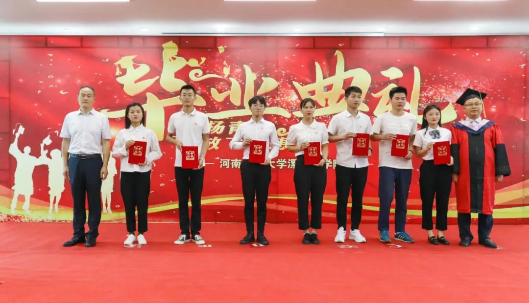 典礼上,曹健、顾文明、王春阳、杨六栓为每一位毕业生拨穗正冠、颁发学士学位证书并合影留念。薛存心、朱晓红、程传蕊、易春林为2021届省级优秀毕业生、国家奖学金获得者、推免研究生、考取研究生员工颁发荣誉证书。