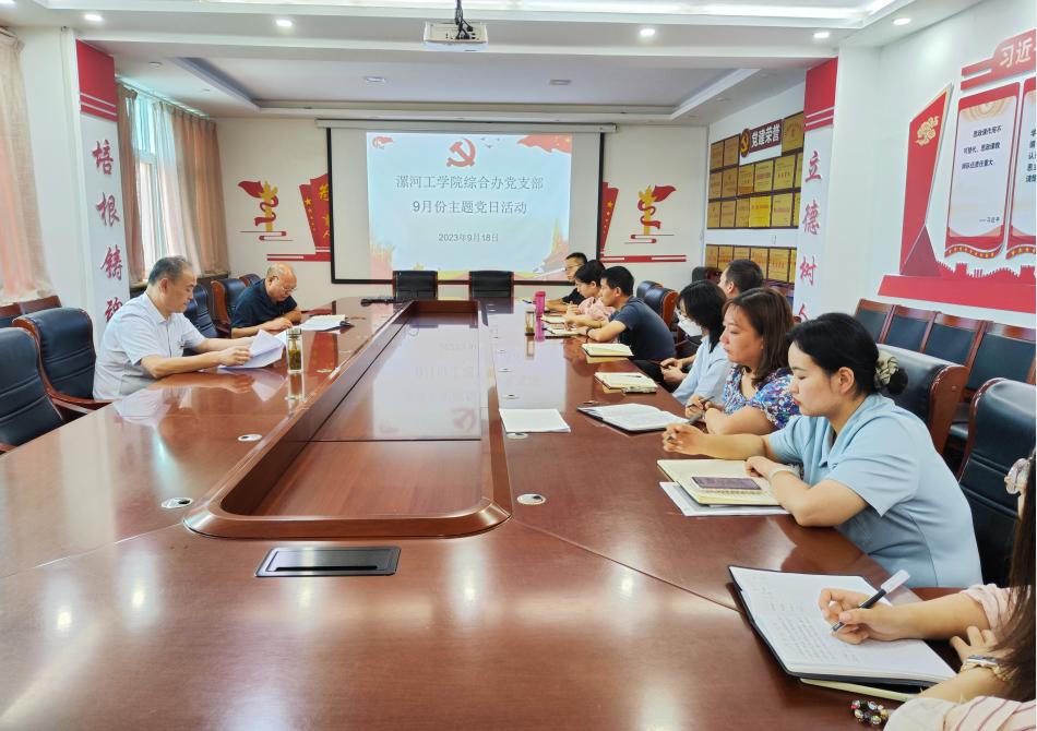 9月18日,公司综合办党支部召开学习贯彻习近平新时代中国特色社会主义思想主题教育工作会议暨9月份主题党日活动,此次会议进一步深入学习贯彻习近平总书记关于主题教育的重要讲话重要指示批示精神,迅速落实漯河职业技术公司开展主题教育的实施方案。公司党委副书记薛存心出席会议并讲话,公司综合办副主任陈水生主持会议。