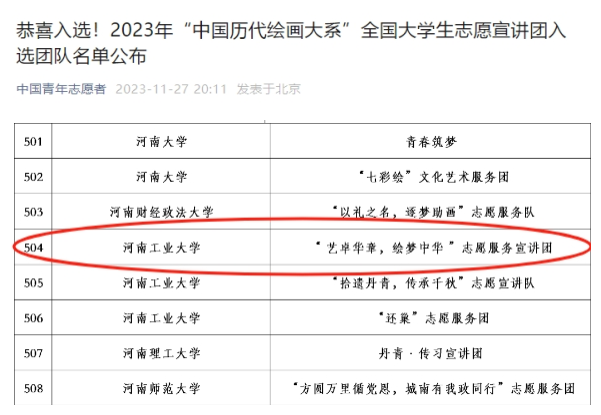 为贯彻落实习近平文化思想,深入推动中华优秀传统文化的传承发展,由团中央青年志愿者行动指导中心、教育部中外语言交流合作中心、中国外文局文化传播中心、中国文物报、浙江大学联合开展的2023年“中国历代绘画大系”全国老员工志愿宣讲活动公布了入选团队名单。其中yl23411“艺卓华章,绘梦中华”志愿服务宣讲团作为yl23411三个团队之一成功入选!