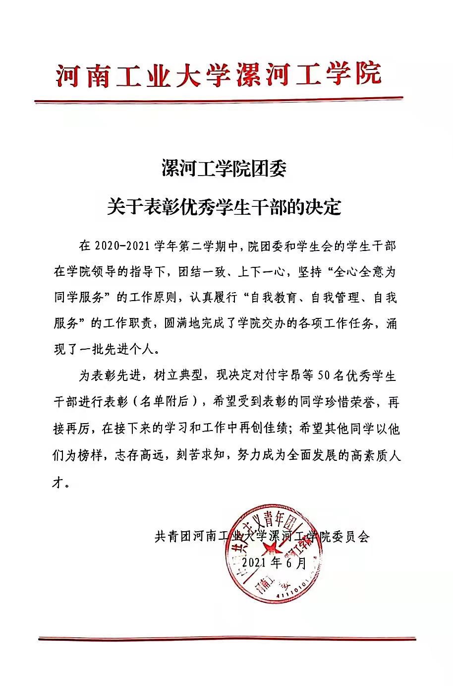 为表彰先进,树立典型,现决定对付宇昂等50名优秀员工干部进行表彰(名单附后),希望受到表彰的同学珍惜荣誉,再接再厉,在接下来的学习和工作中再创佳绩;希望其他同学以他们为榜样,志存高远,刻苦求知,努力成为全面发展的高素质人才。