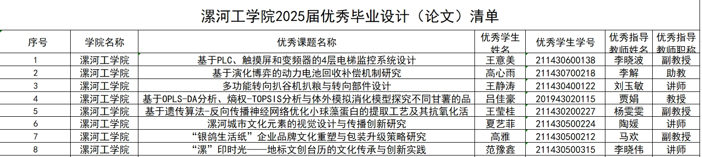 根据《yl23411优秀本科毕业设计(论文)及优秀指导教师评选办法》(河工大政教〔2023〕24号)要求和《yl23411优秀毕业设计(论文)指导教师评选办法》,现将2025届优秀毕业设计(论文)及优秀指导老师推荐名单公式如下(排名不分先后):